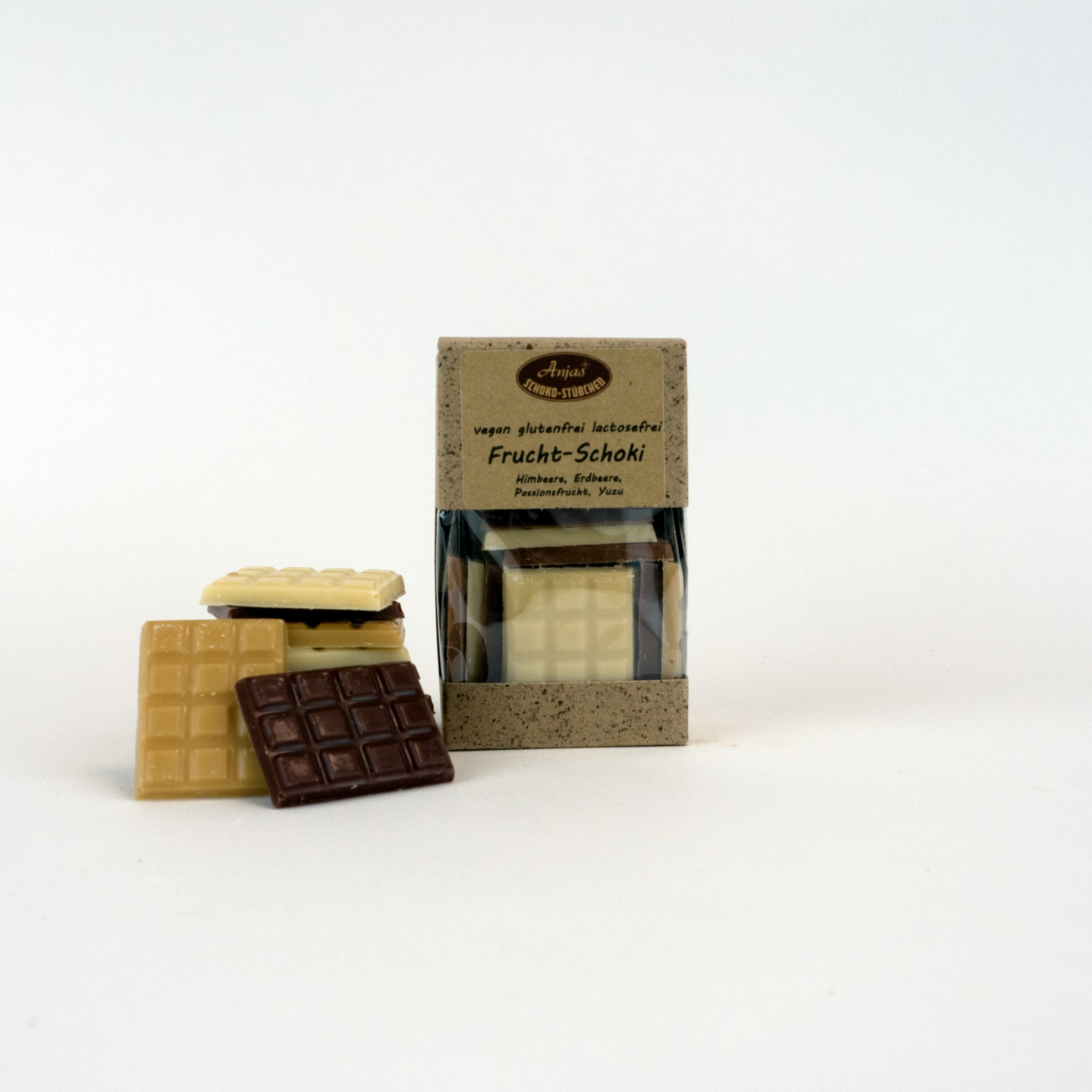 Täfelchen aus Fruchschokolade in den Sorten, Erdbeere, Himbeere, Passionsfrucht und Yuzu. Dieses Knabbervergnügen ist frei von Laktose und Gluten und ist für vegane Ernährung geeignet.