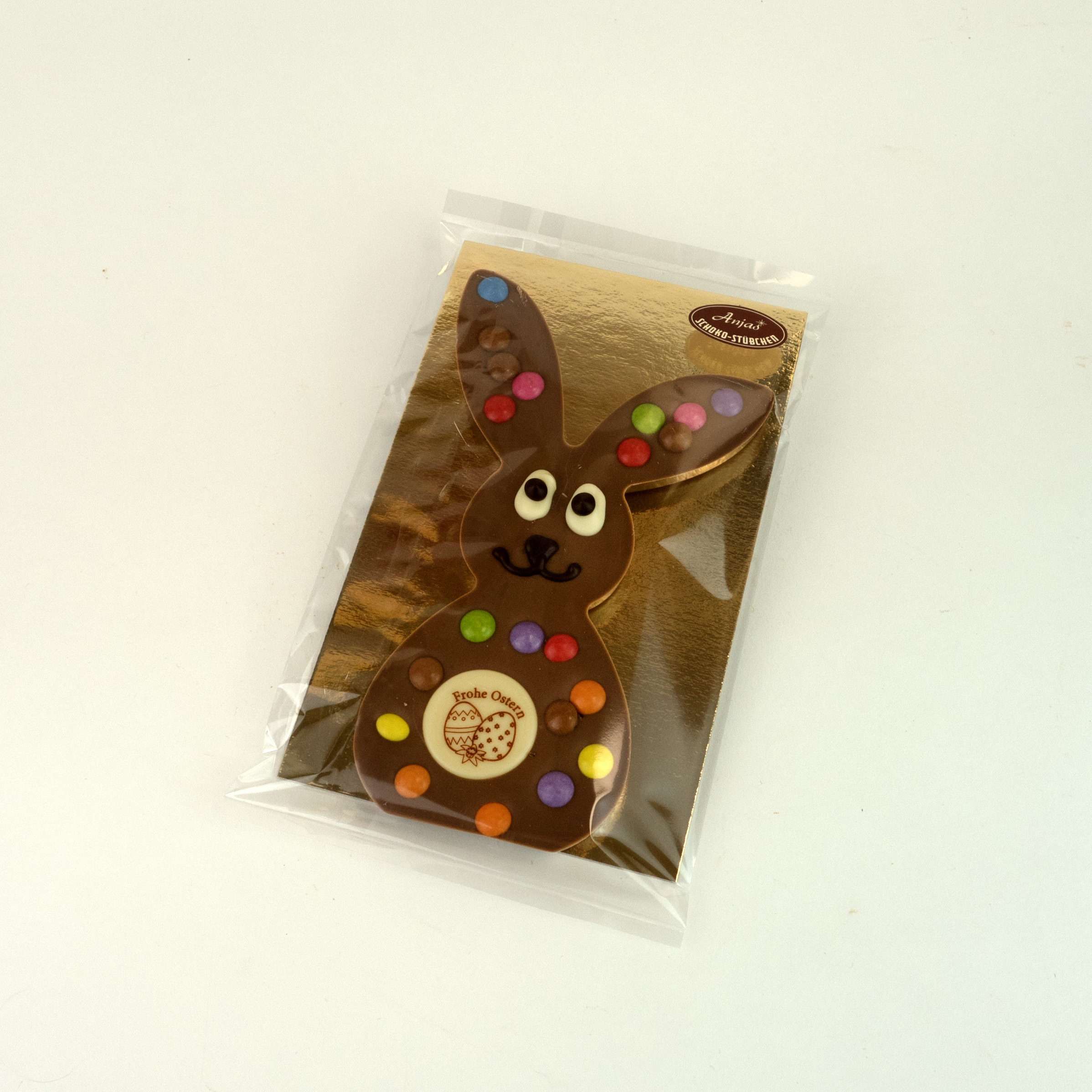 Die Schokoladen Tafel in Form eines Osterhasen ist aus feinster belgischer Vollmilch Schokolade gegossen und wurde von Hand mit bunten Schokolinsen dekoriert. Ein süßer Hingucker und toller Ostergruß für Groß & Klein.
